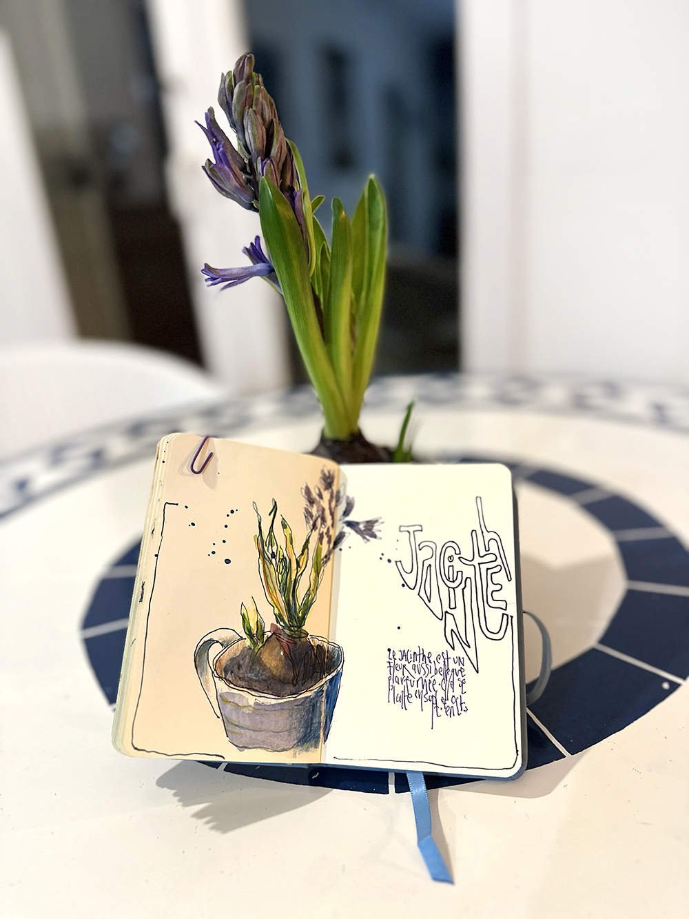Pendant que les voix circulent, je dessine une jacinthe. Un bulbe qu’on m’a offert, et que j’avais envie de remercier à ma façon. Il fait déjà nuit chez moi, je commence à l’aquarelle, puis j’ajoute les stylos et les crayons de couleur. Tout n’est pas complètement sec, mais ce n’est pas grave, je ne vais pas sortir un sèche-cheveux pendant l’appel !!! Je fais avec, les pages résistent un peu, alors je ralentis. Le dessin suit le rythme de la conversation.