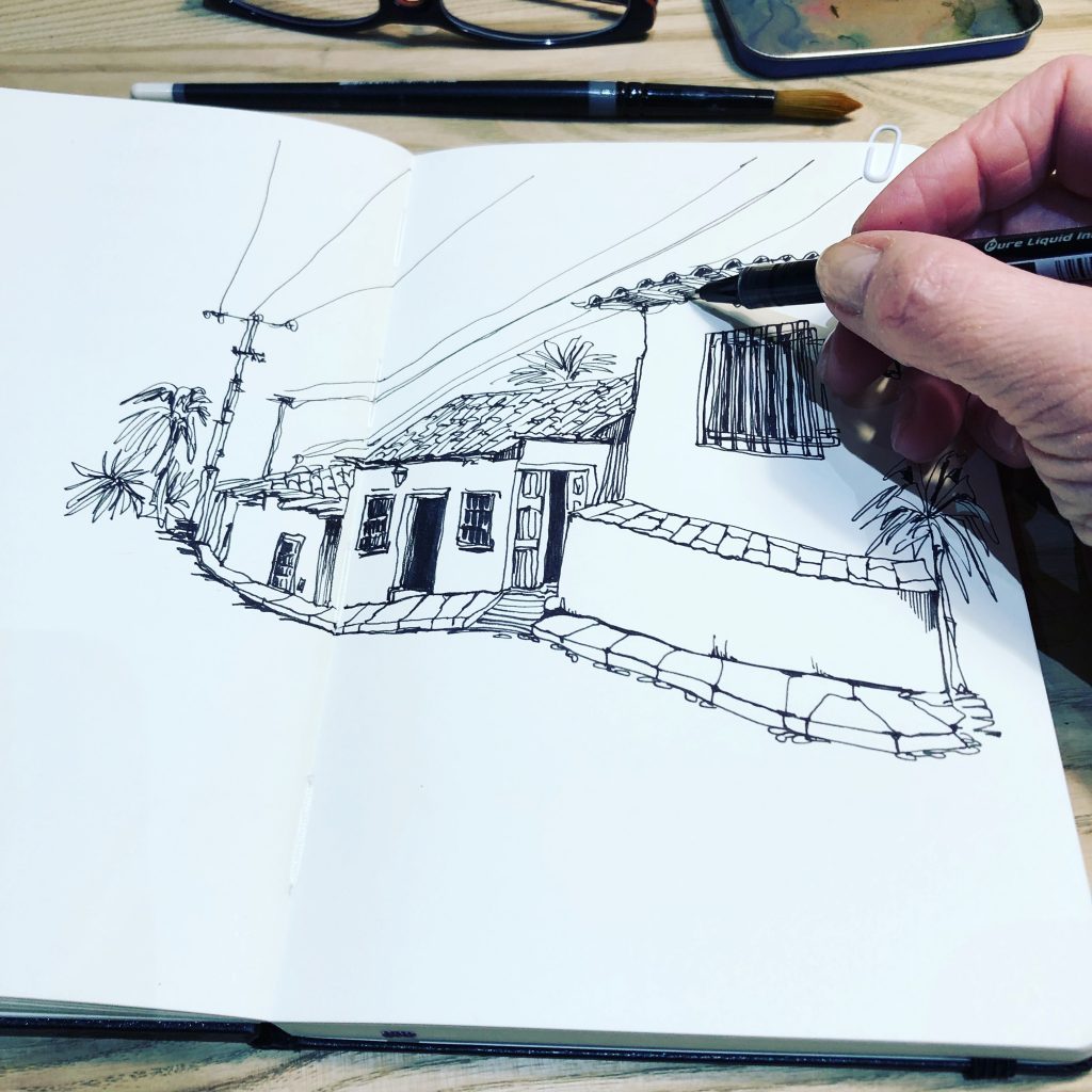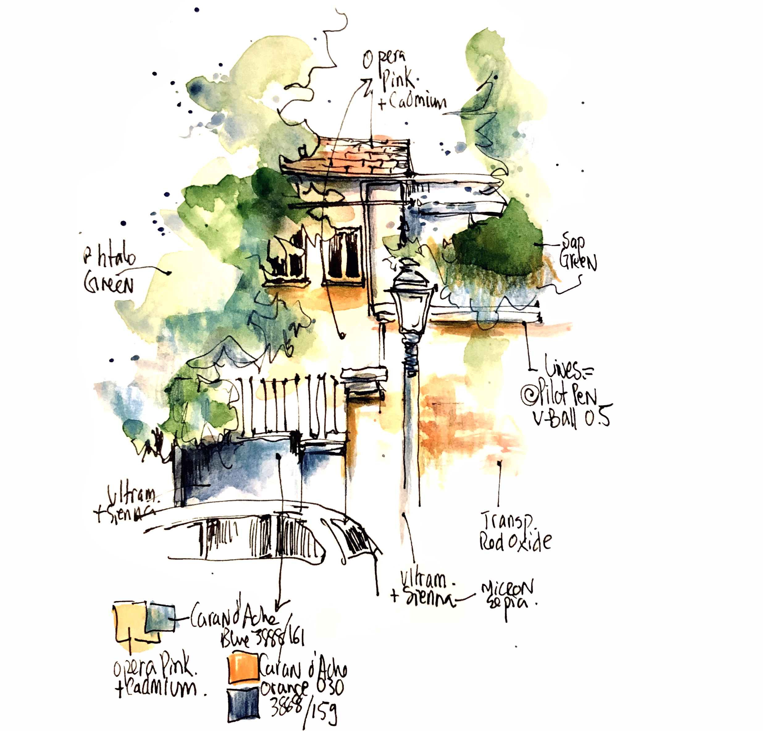 J’utilise aussi le Pilot V-Ball 0.5, une fois sec, il résiste bien à l’eau, ce qui permet de travailler ensuite à l’aquarelle sans abîmer le dessin.