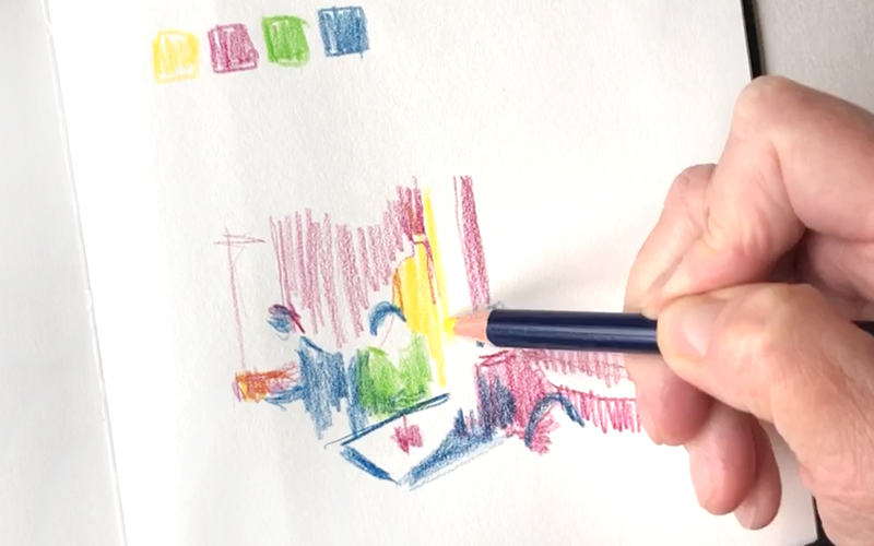 Les crayons Koh-I-Noor “Magic” sont particulièrement intéressants pour cela. Ici, j’ai réalisé les premiers traits avec ces crayons, ce qui est très pratique pour dessiner des scènes de marché ou des vues animées.