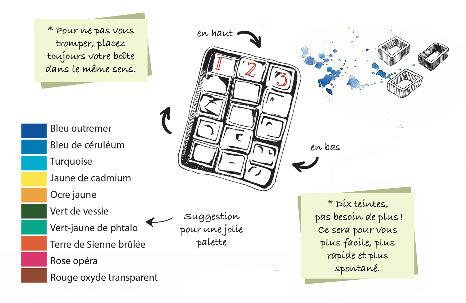 J’utilise une petite palette de couleurs, largement suffisante pour créer une grande variété de nuances. Mes couleurs viennent de marques comme Winsor & Newton, Van Gogh ou Daniel Smith.